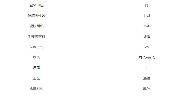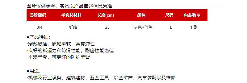·穿戴舒适,质地柔软,富有弹性 ·良好的抓握力和防滑性能,耐磨性能绝佳 ·半浸手套,可更好的防护手背 ·EN388:2242