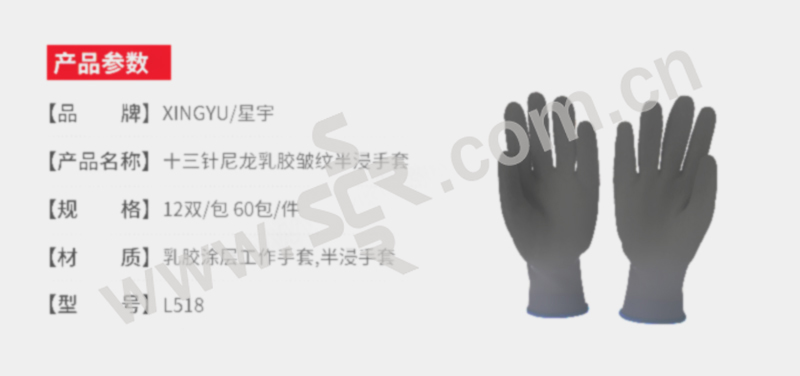 XINGYU/星宇 十三针尼龙乳胶皱纹半浸手套 L518 均码 灰色涂层 1双
