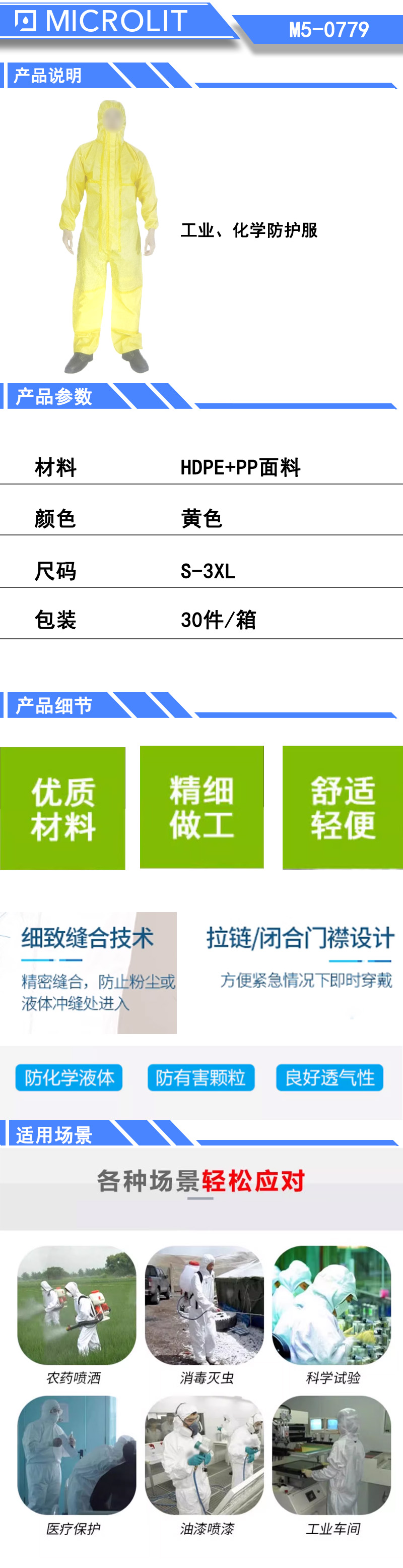 K29771 M5-0779 S-3XL HDPE+PP面料 黄色 30件/箱 采用高密度聚乙烯(HDPE)覆膜于聚丙烯的无纺布面料制作,可对多种有机、无机化学品提供有效防护,适用于欧标3类、4类应用中对无机强酸、强碱类化学品提供有效防护。 140.00
