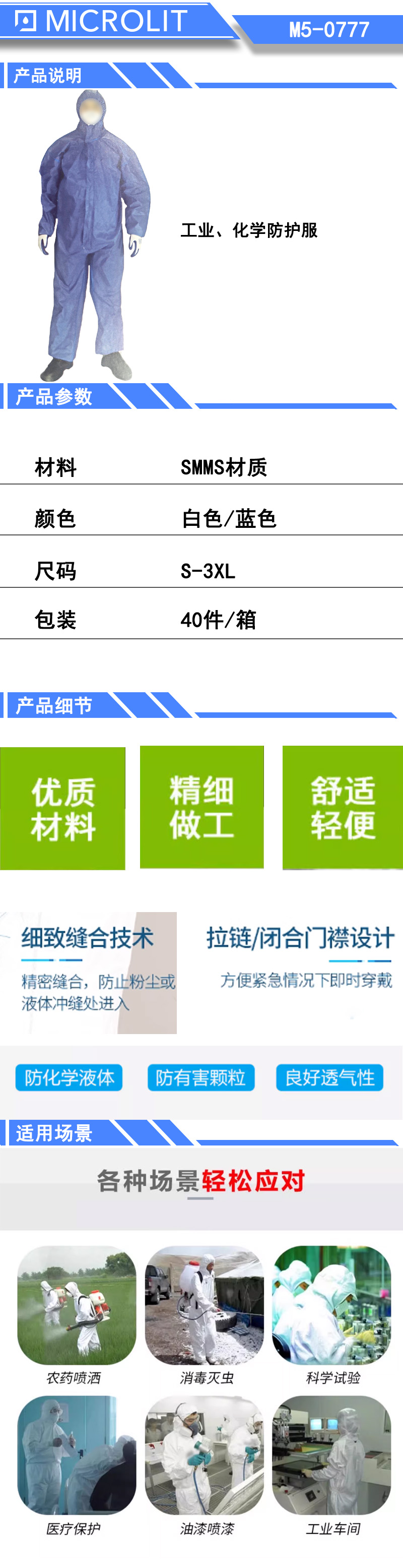 * 防护性能佳,对于粒径大于3微米的微粒过滤效率可达99.9%,对于粒径0.3-0.5的微粒过滤效率可达98.7% * 满足EN1149-5抗静电测试标准; * 高透气性,让使用者具有更好的穿着体验; * 不含硅铜成分,适合喷漆作业; * 优异的版型设计,同时兼顾安全防护性和穿着舒适性