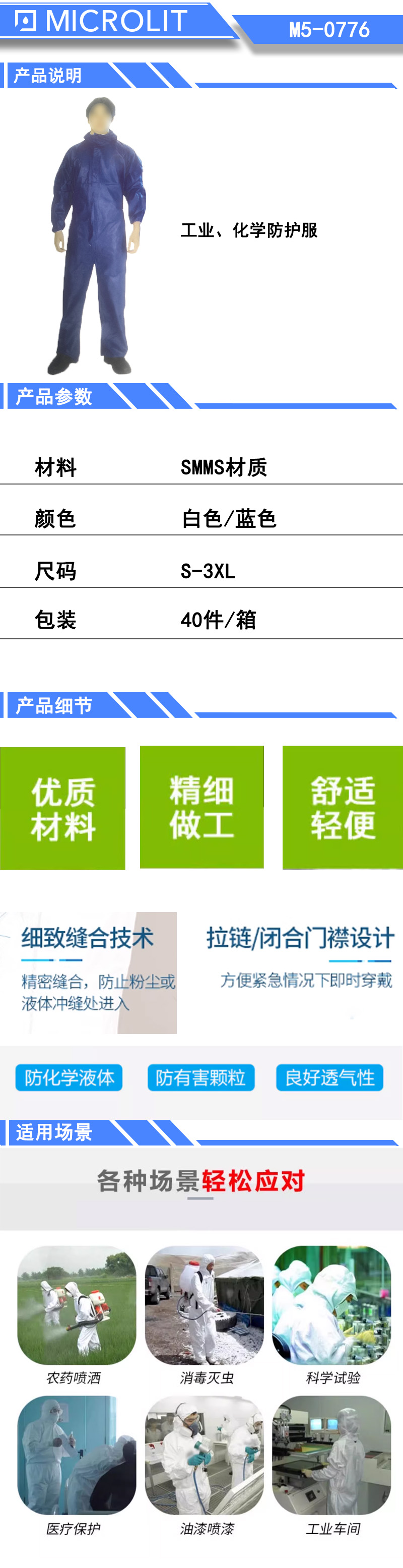 * 防护性能佳,对于粒径大于3微米的微粒过滤效率可达99.9%,对于粒径0.3-0.5的微粒过滤效率可达98.7% * 满足EN1149-5抗静电测试标准; * 高透气性,让使用者具有更好的穿着体验; * 不含硅铜成分,适合喷漆作业; * 优异的版型设计,同时兼顾安全防护性和穿着舒适性