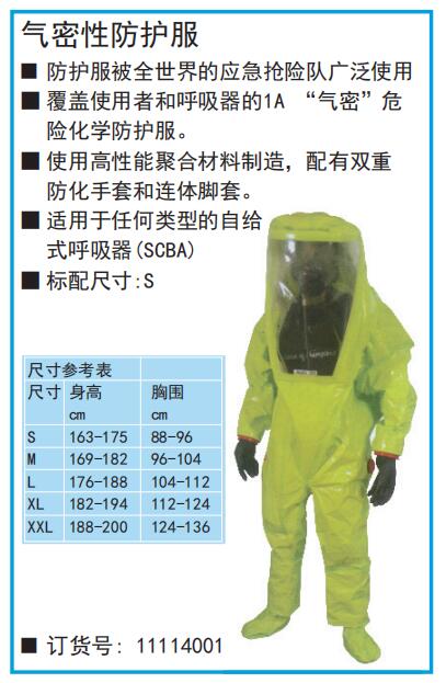 ·防护服被全世界的应急抢险队广泛使用 ·覆盖使用者和呼吸器的1A“气密”危险化学防护服。 ·使用高性能聚合材料制造,配有双重防化手套和连体脚套。 ·尺寸身高cm胸围cm ·S163-17588-96 ·M169-18296-104 ·L176-188104-112 ·XL182-194112-124 ·XXL188-200124-136