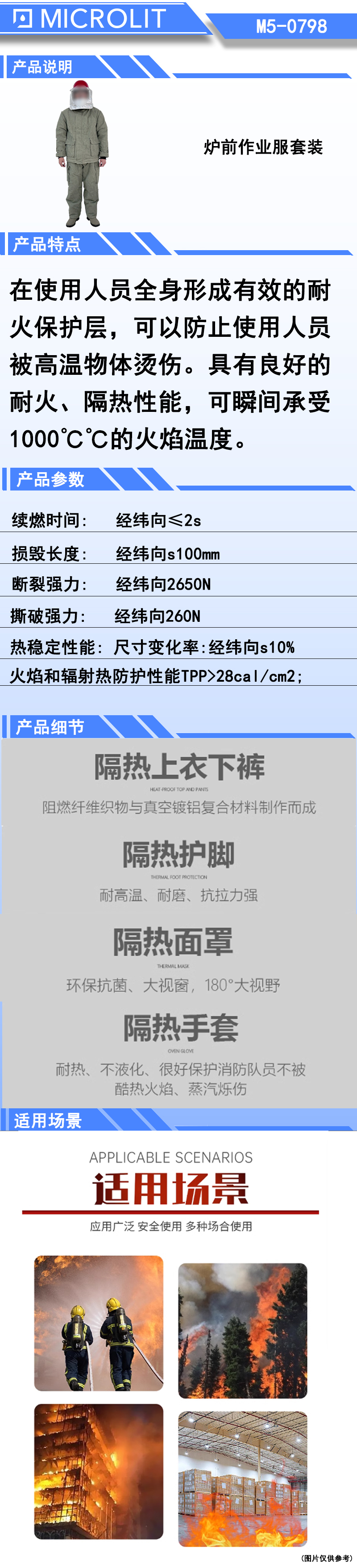 *在使用人员全身形成有效的耐火保护层,可以防止使用人员被高温物体烫伤。具有良好的耐火、隔热性能,可瞬间承受1000℃℃的火焰温度。