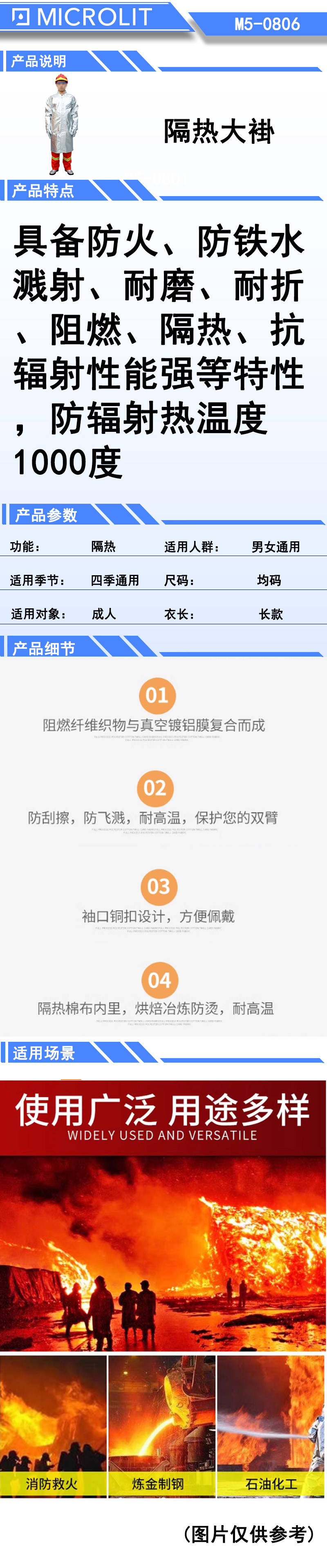 具备阻燃、隔热、耐磨、抗辐射热等特性,防辐射热温度 1000度