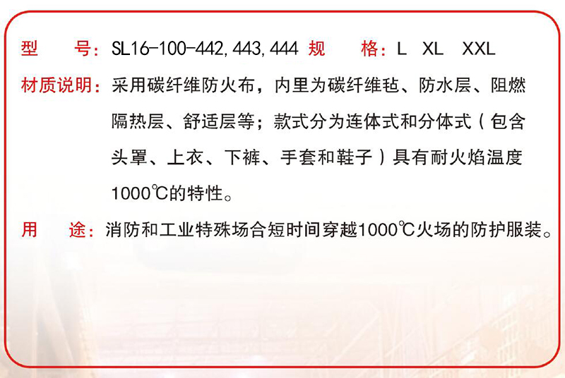 ·采用碳纤维防火布,内里为碳纤维毡、防水层、阻燃隔热层、舒适层等;款式分为连体式和分体式(包含头罩、上衣、下裤、手套和鞋子)具有耐火焰温度1000C的特性
