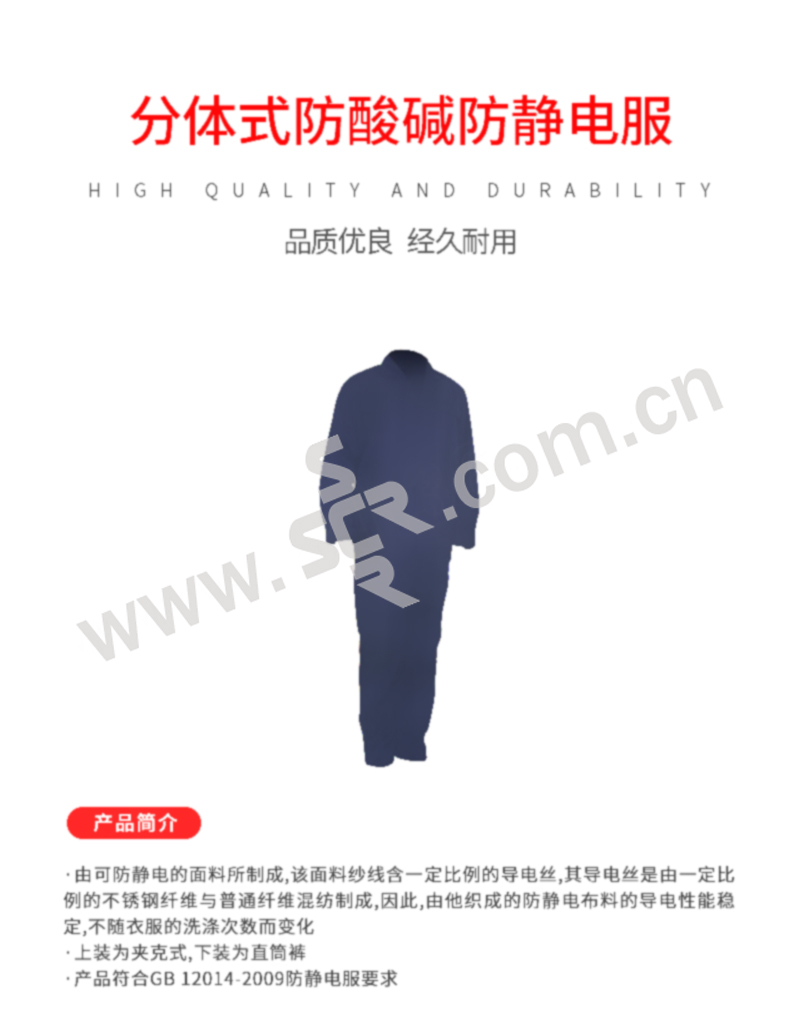 ·由可防静电的面料所制成,该面料纱线含一定比例的导电丝,其导电丝是由一定比例的不锈钢纤维与普通纤维混纺制成,因此,由他织成的防静电布料的导电性能稳定,不随衣服的洗涤次数而变化·上装为夹克式,下装为直筒裤·产品符合GB 12014-2009防静电服要求