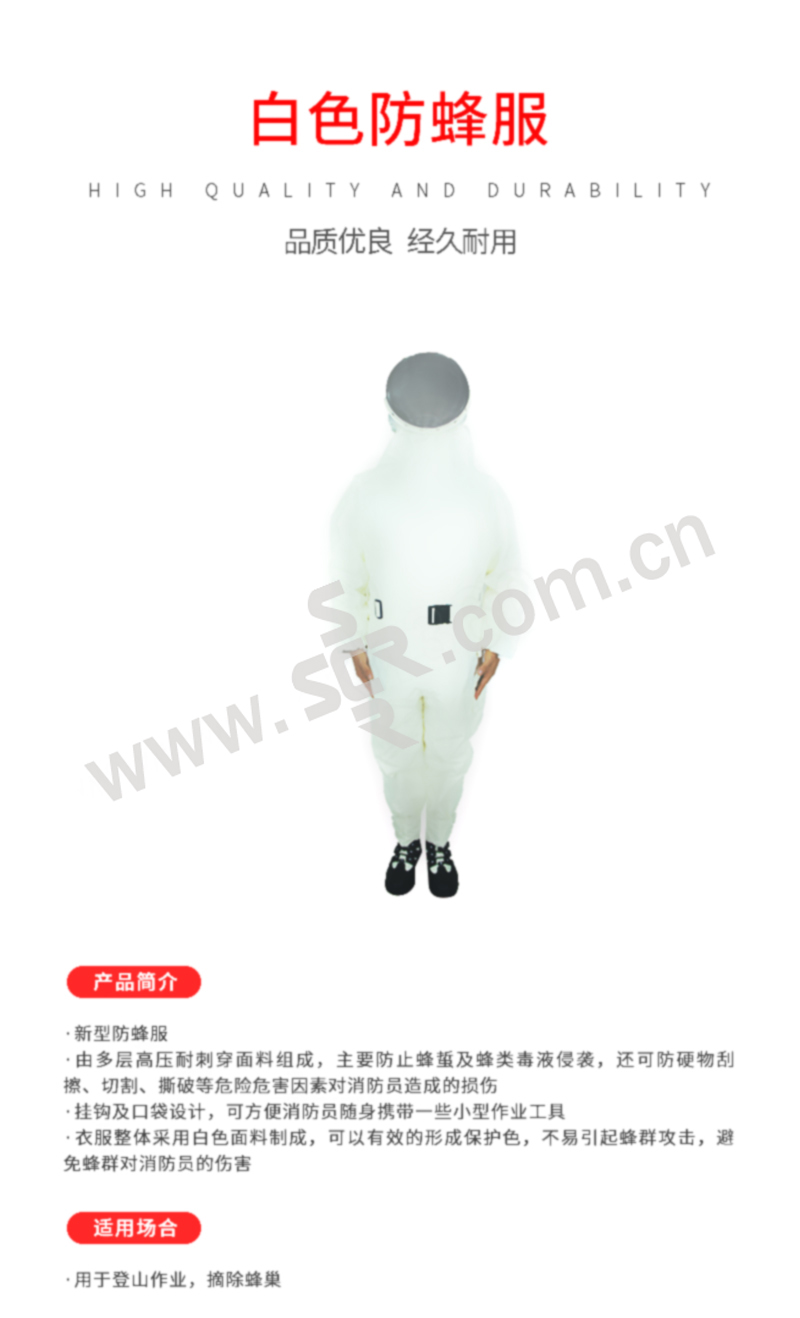 ·新型防蜂服·由多层高压耐刺穿面料组成,主要防止蜂蜇及蜂类毒液侵袭,还可防硬物刮擦、切割、撕破等危险危害因素对消防员造成的损伤·挂钩及口袋设计,可方便消防员随身携带一些小型作业工具·衣服整体采用白色面料制成,可以有效的形成保护色,不易引起蜂群攻击,避免蜂群对消防员的伤害