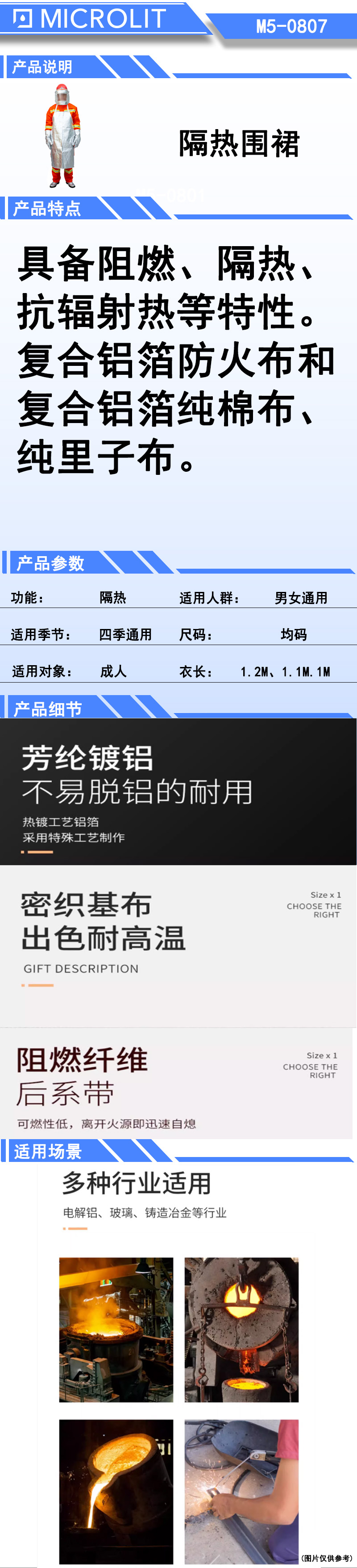 K29744 M5-0807 衣长1.2米、1.1米、1米。 复合铝箔防火布和复合铝箔纯棉布、纯里子布。 石油、化工、冶金、玻璃、窑炉等行业面对钢化铁水溅射及高温场合穿戴的防护服装 320.00