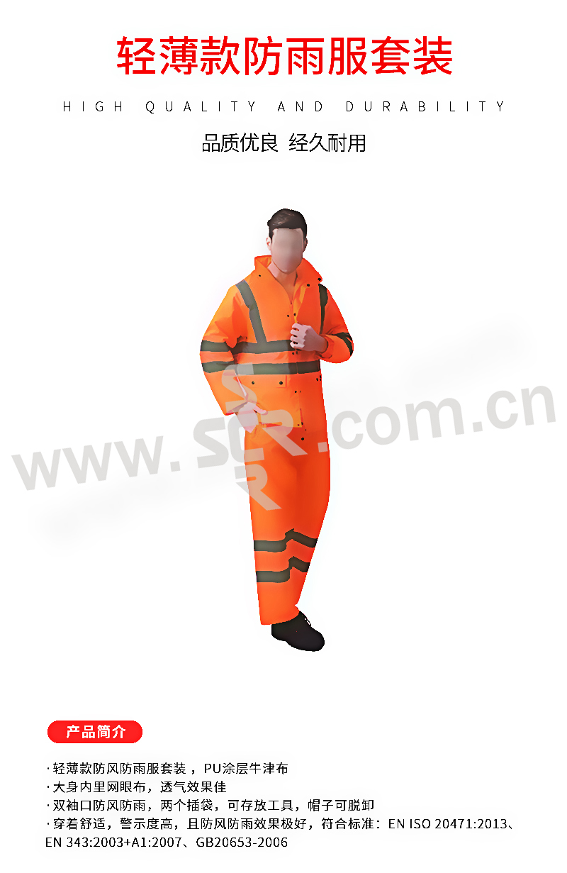 ·轻薄款防风防雨服套装 ,PU涂层牛津布 ·大身内里网眼布,透气效果佳·双袖口防风防雨,两个插袋,可存放工具,帽子可脱卸·穿着舒适,警示度高,且防风防雨效果极好符合标准:EN ISO 20471:2013、EN 343:2003+A1:2007、GB20653-2006