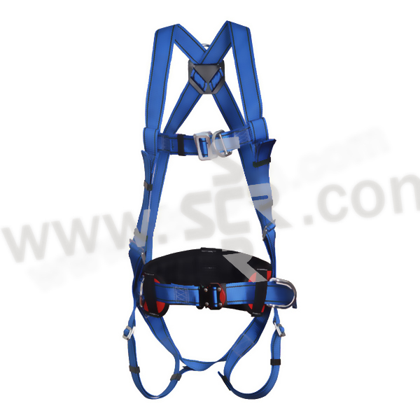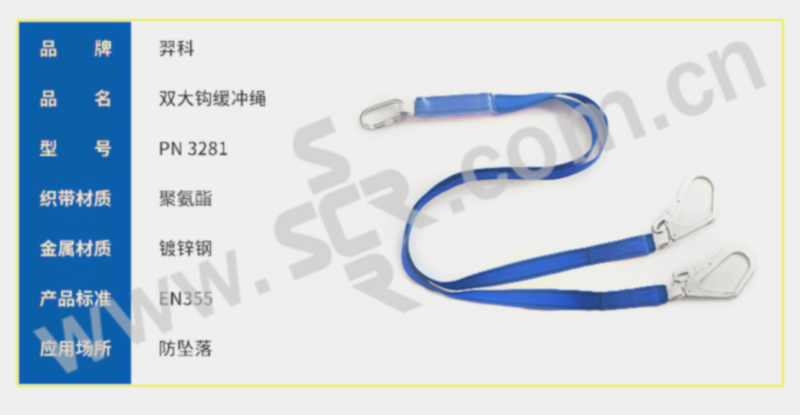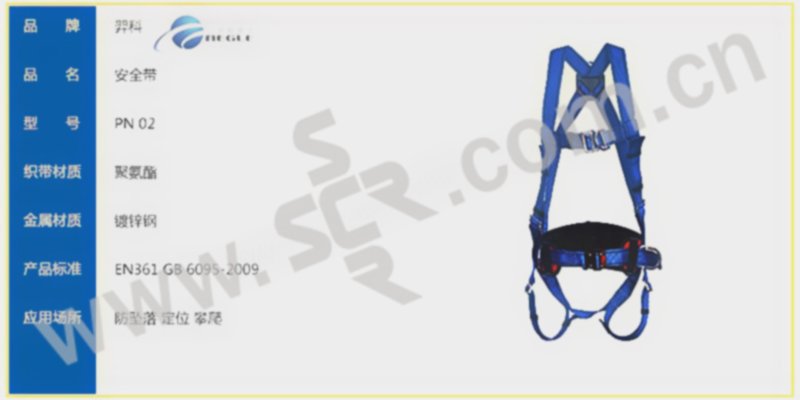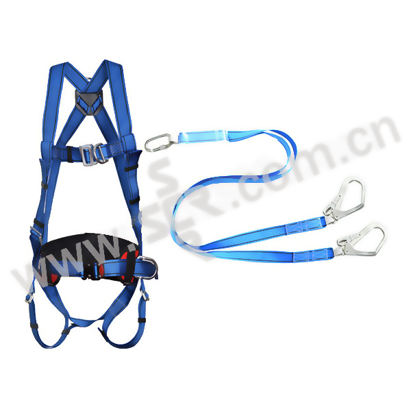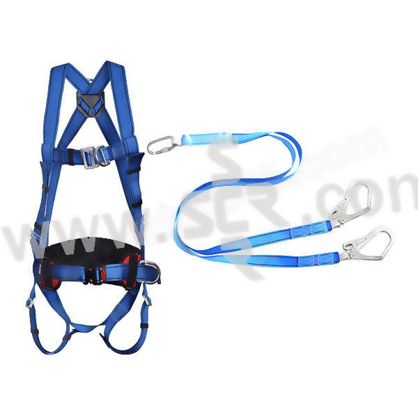 ·安全带套装·44毫米双色聚酯材质颜色醒目,便于检查·所有金属部件均使用镀锌钢材质,更耐腐蚀·胸带和跨带可根据用户需求进行调节·背部D型环,可用于防坠落·胸前带有一个D型环,可用于攀爬或救援作业·宽大的腰垫,为作业人员的腰部提供舒适保护·腰部两侧的定位环用于工作定位,解放作业人员的双手·腰带搭扣为快插口,使用方便·双头缓冲绳由44毫米宽蓝色聚酯材料制成·长度(含安全钩):1.8米,缓冲包展开长度:1.2米·缓冲带两端织带环上有保护套,延长使用寿命·冲击作用力峰值小于6KN·两端分别配有镀锌钢安全钩和两个脚手架安全挂钩