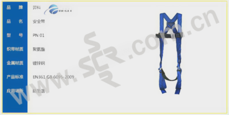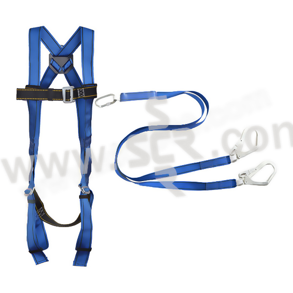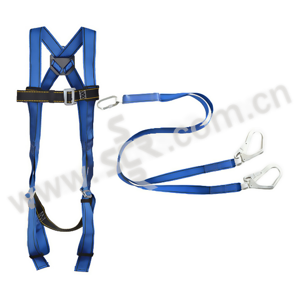 ·安全带套装·44毫米双色聚酯材质颜色醒目,便于检查·所有金属部件均使用镀锌钢材质,更耐腐蚀·胸带和跨带可根据用户需求进行调节·背部D型环,可用于防坠落·双头缓冲绳由44毫米宽蓝色聚酯材料制成·长度(含安全钩):1.8米,缓冲包展开长度:1.2米·缓冲带两端织带环上有保护套,延长使用寿命·冲击作用力峰值小于6KN·两端分别配有镀锌钢安全钩和两个脚手架安全挂钩