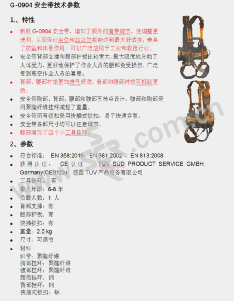 ·符合标准: EN 358:2019、EN 361:2002 、EN 813:2008·获得认证: CE认证 TÜV SÜD PRODUCT SERVICE GMBH, Germany(CE0123) 德国TUV产品服务有限公司·工具挂环: 有·最大年限:6-8年 ·负载人数:1 人·背部支撑:有 ·腰部护板:有·快插锁扣:有·重量:2.0 kg ·尺寸:可调节·织带:聚酯纤维·胸部挂环:聚酯纤维·腹部挂环:聚酯纤维·腰侧挂环:钢·背部挂环:钢·快插式锁扣:铝·增加了额外的肩带调节,使调整更便利,从而保证坐位和站立位都能达到最大舒适度,兼具了防坠和休息作用·安全带背部支撑和腰部护板比较宽大,最大限度地分散了人体受力,更好地保护了作业人员的腰部免受损伤,广泛受到高空作业人员的喜爱· 背部、腰部衬垫更加透气舒适,肩部和腿部衬垫可拆卸更换;安全带胸部、背部、腰部和腹部五挂点设计,腹部和胸部采用聚酯纤维挂环减轻了重量·所有锁扣采用快插式锁扣,易于快速穿脱;可增加牛皮耐磨背板配件,防止靠塔攀爬时安全带背部磨损,延长安全带使用寿命