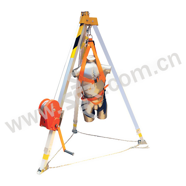 ·由主体、吊索、绞盘、环型保护链组成·采用高强度轻质合金制造的可伸缩支脚,安全系数大于10,底脚设有环型保护链·绞盘上设有上升、下降自锁装置,保证了吊索的安全性·吊索选用特制的不锈钢丝绳,柔韧度好,且不会因锈蚀或缺油造成钢索吊环·方便的装配,可因地制宜的装置在井口、坑口、且不受地面高低不平的限制·最大载荷:≤160kg·收拢长度:1.8m·撑开长度:2.4m·可调垂直高度范围:1.34-2.2m·手动柄力:≤500N·钢丝绳长度:30m