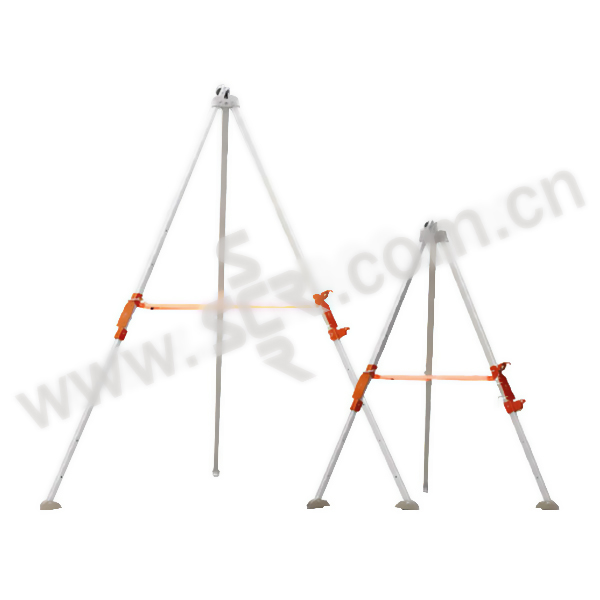 ·铝制高强度救援三脚架·带固定卡座,可调节支脚高度1.7-3米。地面打开最大直径2.65米·带有脚蹬,便于三角架在最高点位置安装绞盘和滑轮组·适合提升负载,固定及救援·重物绞盘和救援速差绞盘容易拆卸及拼装·三脚架头部装有三个额外锚挂点,可承载500kg以内重物·通过国家消防装备质量监督检验中心消防检测