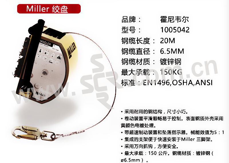 · Miller 绞盘· 钢缆长度:20 米 Φ 6.5mm· 适用于多种场合,包括密闭空间进出,救援,定位和物品吊装· 采用耐用的钢结构,尺寸小巧· 卷动装置平滑顺畅易于控制。表面钢质外壳采用黄颜色电镀处理。· 带超速制动装置和坠落指示器。械能效值为5:1· 集成的支架便于快速安装于Miller 三脚架· 采用万向抓钩,方便安全· 最大承载:150 公斤· 符合标准: EN1496,OSHA,ANSI