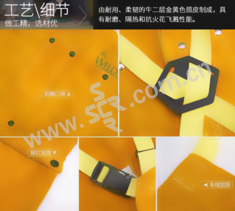 ·由耐用柔韧的牛二层金黄色颈皮制成,具有耐磨隔热和抗火花飞溅性能