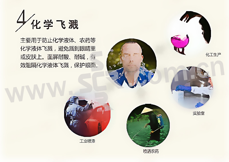 ·防止化学液体飞溅,油烟飞溅,防冲击,防金属飞溅物