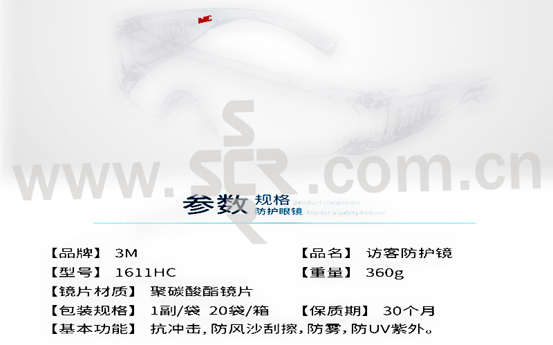 3M 访客用防护眼镜 3M-1611HC 防刮擦防雾 20副 1箱