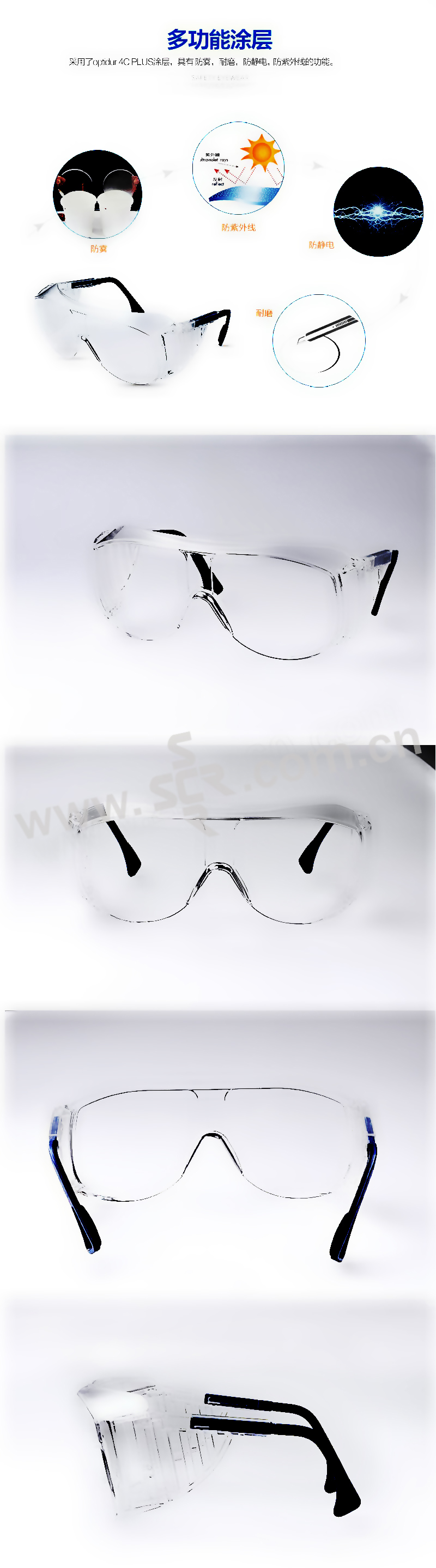 ·访客安全眼镜,可与矫视眼镜一起使用·镜框:透明·镜腿:蓝/黑色·镜片:透明·卓越加强涂层,内外侧防刮,很强防雾·全景式镜片,侧翼防护,为眼部周围提供大范围防护·镜腿可调节,适合不同脸型与头型的佩戴者·宽阔视野