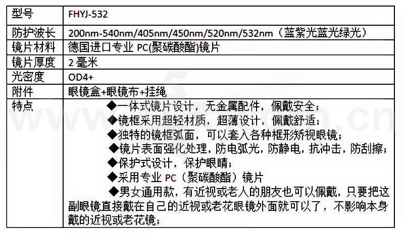 FULASER/为你激光 激光护目镜 FHYJ-532 防护波长200~540nm 1个