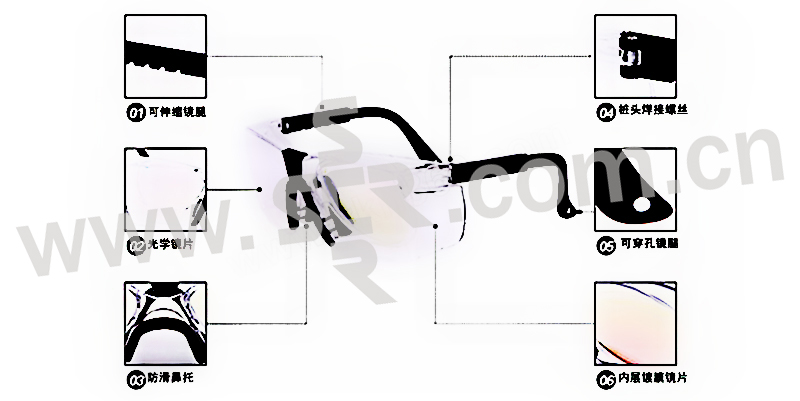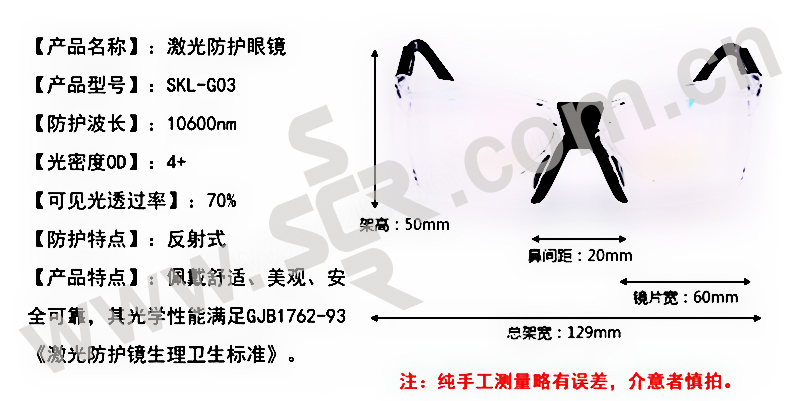 ·是一种高效安全的护目镜 ·适用于多种激光器 ·配戴舒适、美观、安全可靠 ·其光学安全性能完全满足GJB1762-93《激光防护镜生理卫生标准》 ·这款激光安全眼镜是反射式的,可全方位防护特定波段1064NM的激光和强光 ·可见光透过率达到85%以上,光密度为5。0以上,(OD+5,OD+6),衰减率较高(10-6·有CE认证和国家实验室检测报告