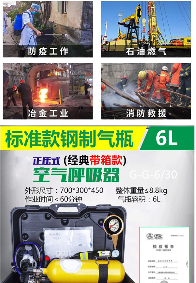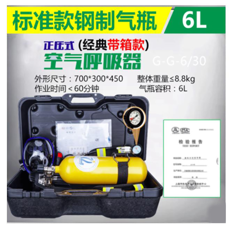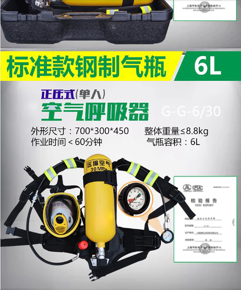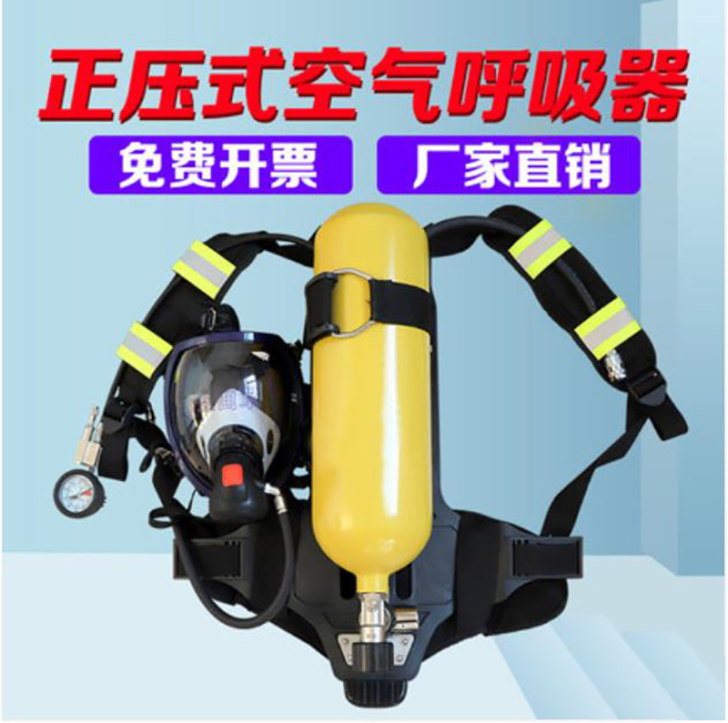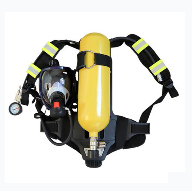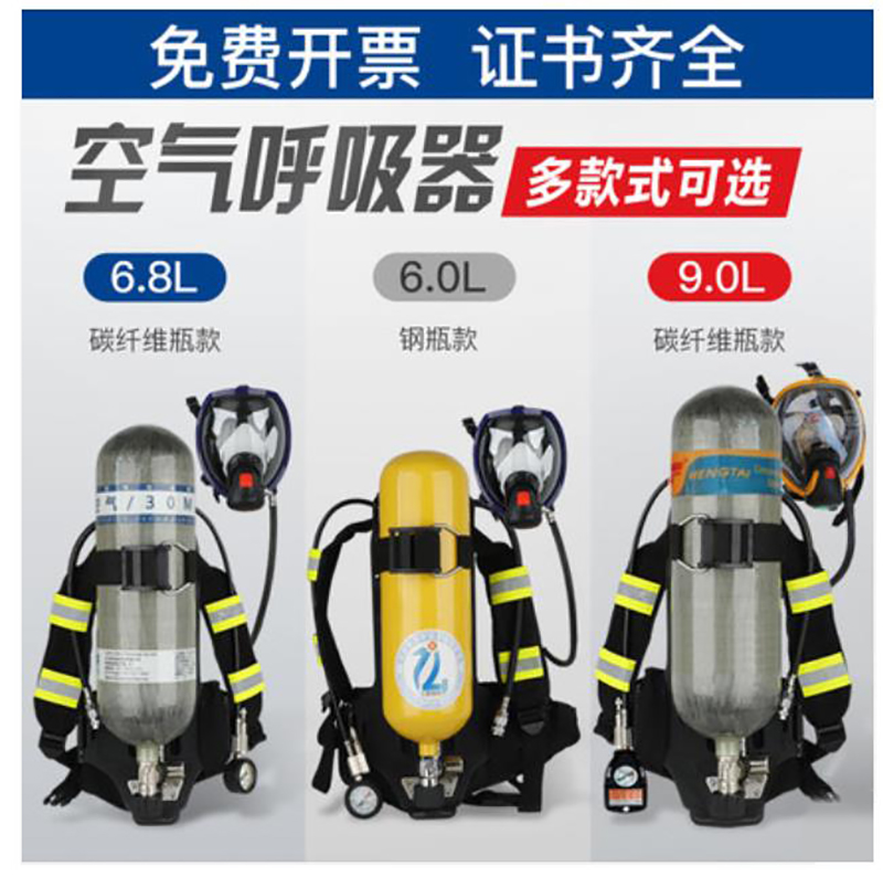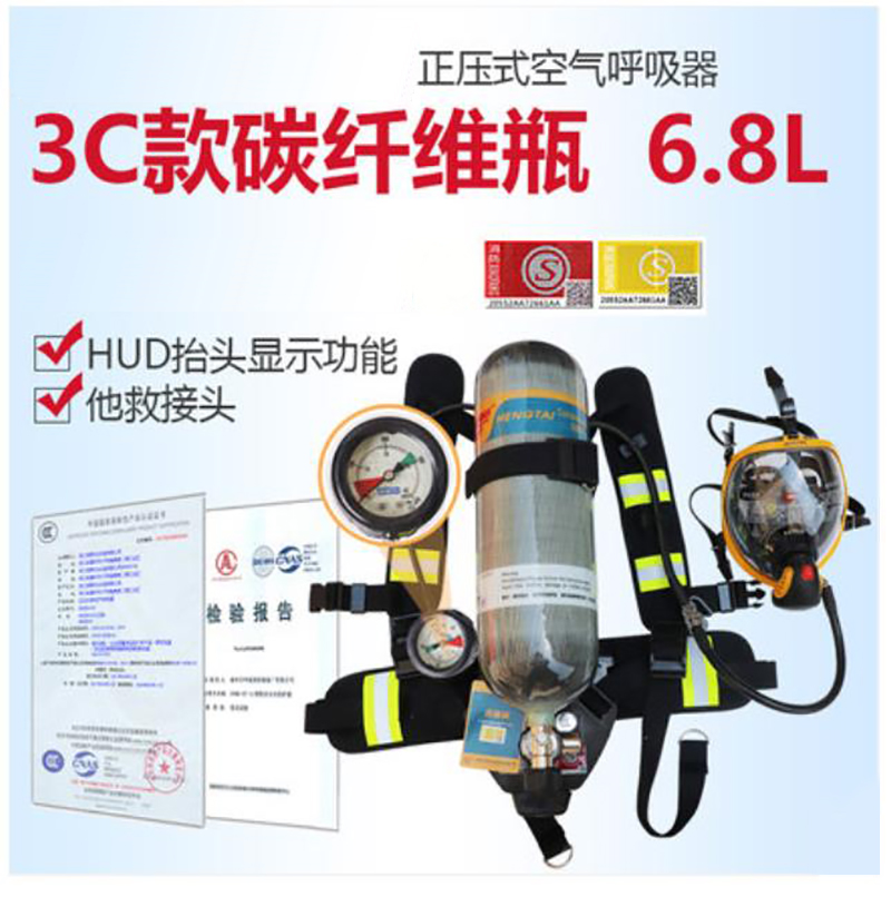 阻燃全面罩,具有防雾功能,球形面罩,视野率满足要求 背带及腰带采用芳纶材质,具有阻燃性能 ·6.8L碳纤维气瓶 气瓶质量轻,储气量大,配有阻燃保护套,配自锁瓶阀,防止意外关闭 ·供气阀外观黄色醒目,363度快速插接,操作方便,供气阀输出压力稳定,呼吸舒适度高