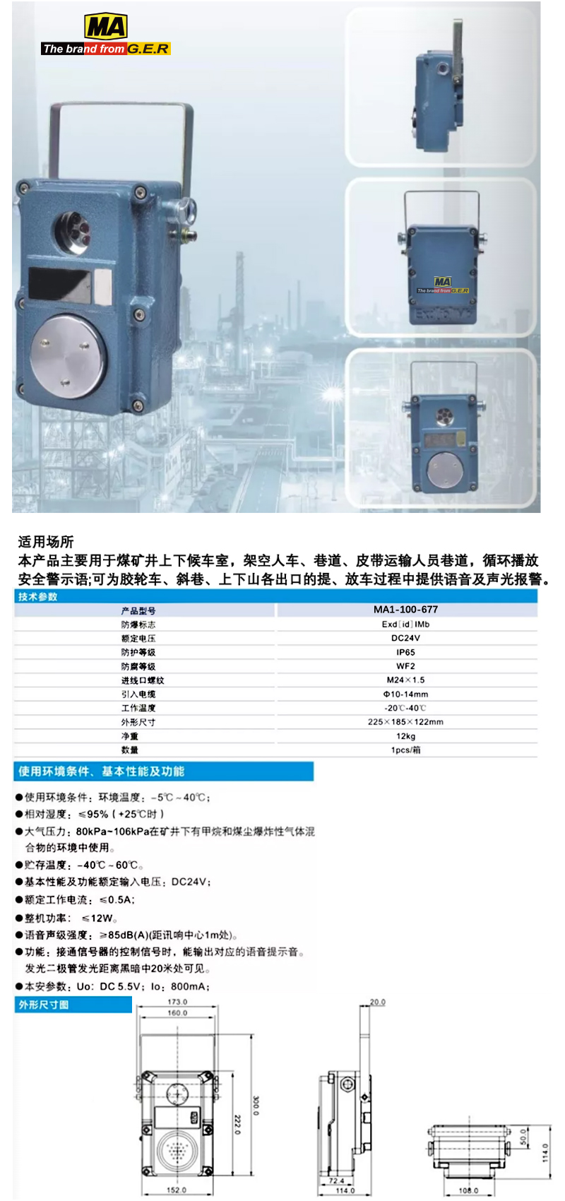 ·使用环境条件:环境温度:-5℃~40℃;相对湿度:≤95%(+25℃时) 大气压力:80kPa~106kPa在矿井下有甲烷和煤尘爆炸性气体混合物的环境中使用。 贮存温度:-40℃~60℃。 基本性能及功能额定输入电压:DC24V;额定工作电流:≤0.5A;整机功率:≤12W。 语音声级强度:≥85dB(A)(距讯响中心1m处)。 功能:接通信号器的控制信号时,能输出对应的语音提示音。发光二极管发光距离黑暗中20米处可见。本安参数:Uo:DC5.5V;lo:800mA;