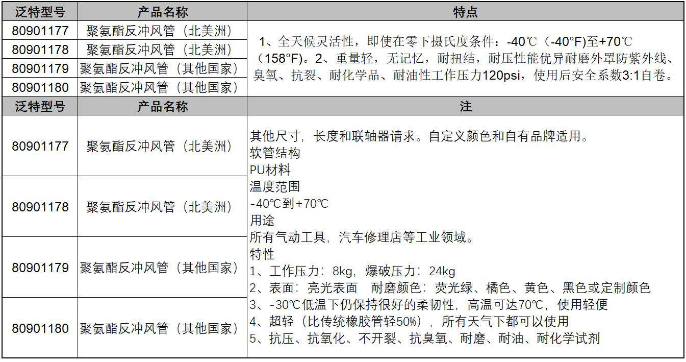 ·重量轻,无记忆,耐扭结,耐压性能优异耐磨外罩防紫外线、臭氧、抗裂、耐化学品、耐油性最高工作压力120psi,使用后安全系数3:1自卷。