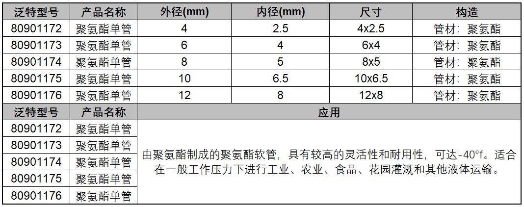 A32362 80901173 4mm 6mm 4mm 6×4mm 由优质聚氨酯制成的聚氨酯软管,具有极高的灵活性和耐用性,最高可达-40°f。非常适合在一般工作压力下进行工业、农业、食品、花园灌溉和其他液体运输。 管材:聚氨酯 1586.50