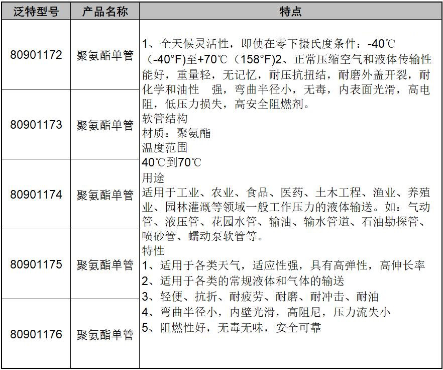 ·正常压缩空气和液体传输性能好,重量轻,无记忆,耐压抗扭结,耐磨外盖开裂,耐化学和油性极强,弯曲半径小,无毒,内表面光滑,高电阻,低压力损失,高安全阻燃剂。