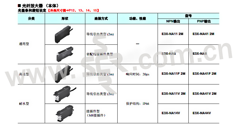· E3X-A用8回转调整旋钮即可进行微调整的通用型;带有应差可变旋钮;使用脉冲亮灯进行20μs的超高速应答;以绿色光源可检测微妙的色差。 E3X-NA灵敏度可调式光纤放大器。 直接观测光量变化的LED入光量级显示;节省配线接插件、省空间;采用光通信方式,可防止互相干扰,可密集安装(最多5台)。 E3X-DA-S/MDA 数字式光纤传感器。 将受光量调整到最佳值,搭载“光量调整(最佳光量设定)功能”;通过采用新开发的4元素LED+APC(Auto Power Control)回路,能实现长期稳定检测。 节省配线接插件;每一频道5mm(MDA型);10mm宽的主体上凝聚2个放大器,节省约1/2空间,节省约40%电力;可进行AND/OR控制输出(MDA型)控制输出。 1A3504负荷电源电压DC 30V以下,负荷电流100mA以下(残留电压1V以下)集电极开路输出型,入光时ON/遮光时ON开关转换式。 1A3517、1A3518负载电流50mA以下(剩余电压1V以下),集电极开路输出型,入光时ON/遮光时ON开关转换式。 1A3519、1A3520、1A3521负载电源电压DC 26。4V以下,集电极开路输出型,负载电流50mA以下(残留电压1V以下)。