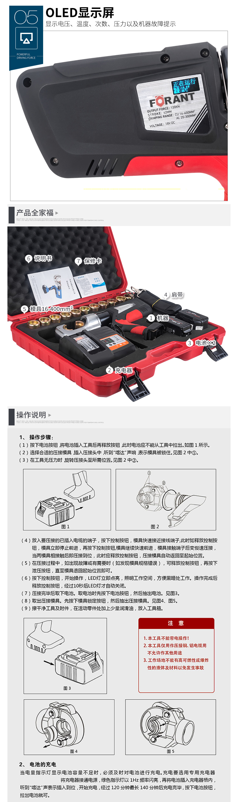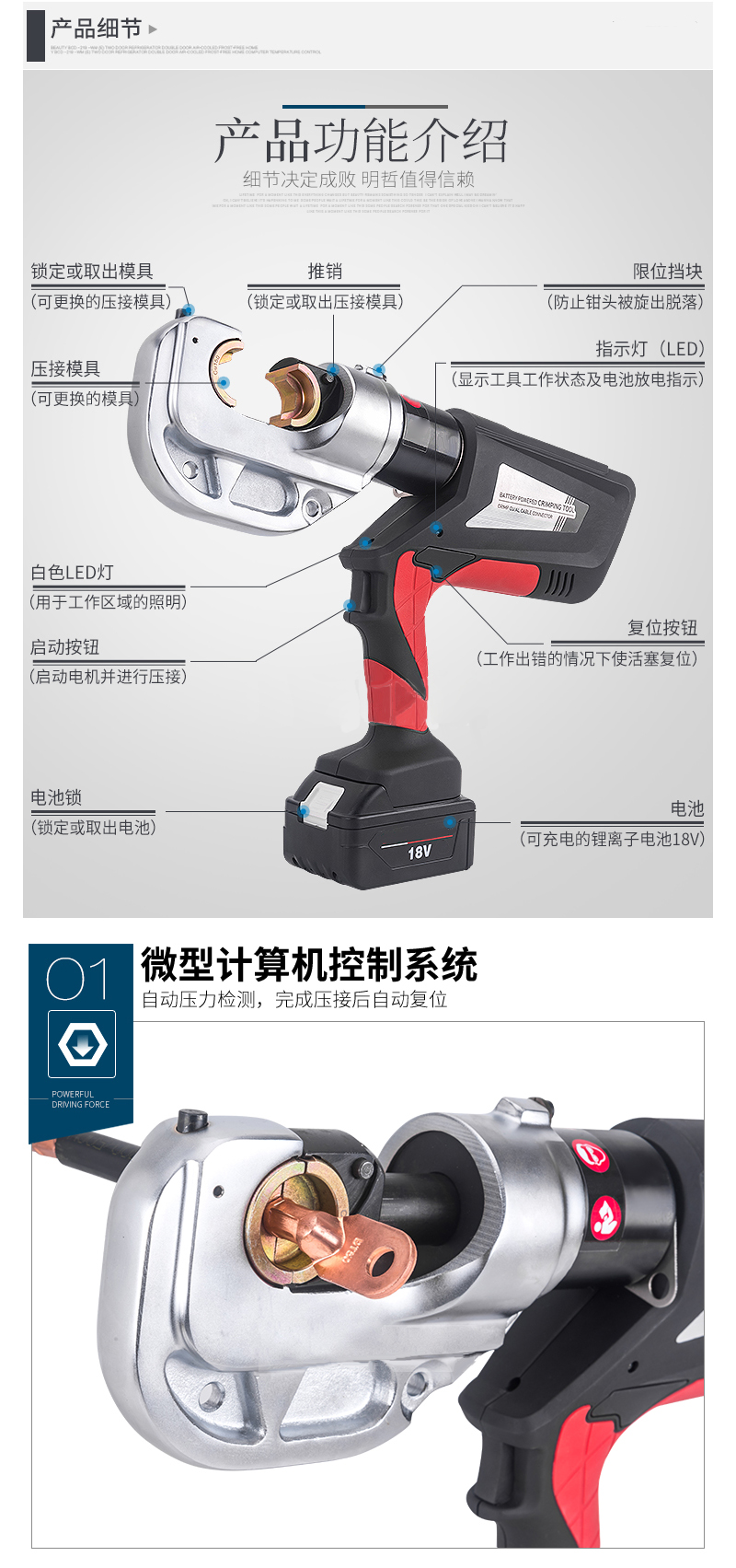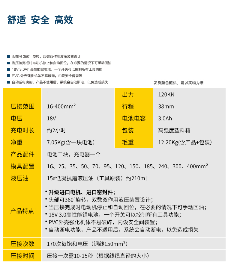 ·头部可 350°旋转,双数双作用液压装置设计 ·当压接完成时电动机停 止和自动回位,在必要的情况下可手动回油 ·18V 3·0Ah高性能锂电池,一个开关可以控制所有工具功能 ·PVC外壳强化机体不易破碎,内设安全阀装置 ·自动断电功能,产品不使用后,系统会自动断电,以免造成损失