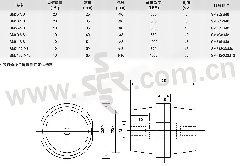 SM25红色绝缘子 高度25 螺纹M6(20只)