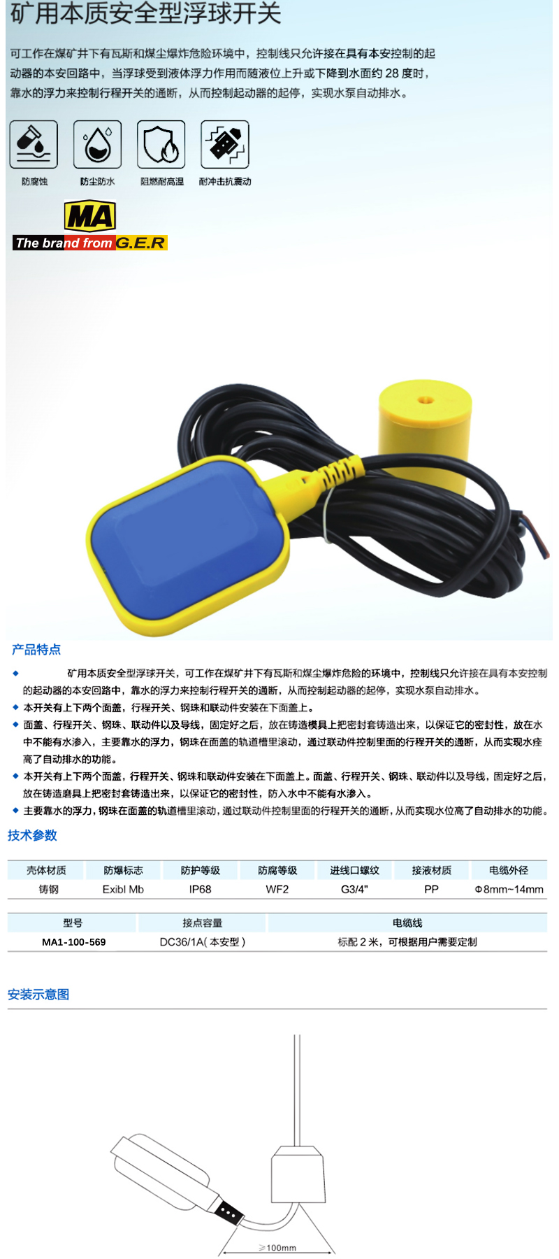 E14466 MA1-100-569 G3/4'' ExiblMb 铸钢 IP68 WF2 PP φ8mm-14mm DC36/1A(本安型) 标配2米,可根据用户需要定制 945.00