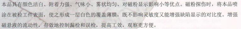 ·在表面粗糙的焊接件或铸钢件磁粉探伤时,由于工件表面凹凸不平,或者由于磁痕颜色与工件表面颜色对比度很低时,会使检出的缺陷难于发现,容易造成漏检。 ·为了提高缺陷磁痕与工件表面颜色的对比度,探伤前可在工件表面上先涂上一层白色薄膜(即:反差增强剂),厚度约为25-45u m然后磁化工件、喷洒黑磁粉,缺陷部位的表面磁粉就可清晰可见磁粉堆积指示。 ·具有省时、省工、操作方便、检测结果更加可靠等特点,是磁粉探伤工作者的好帮手。