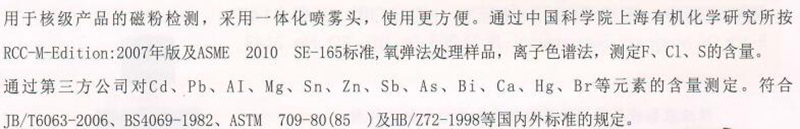 ·用于核级产品的磁粉检测,采用一体化喷雾头,使用更方便。通过中国科学院上海有机化学研究所按RCC-M-Edition:2007年版及ASME 2010 SE-165标准,氧弹法处理样品,离子色谱法,测定F、C1、S的含量。