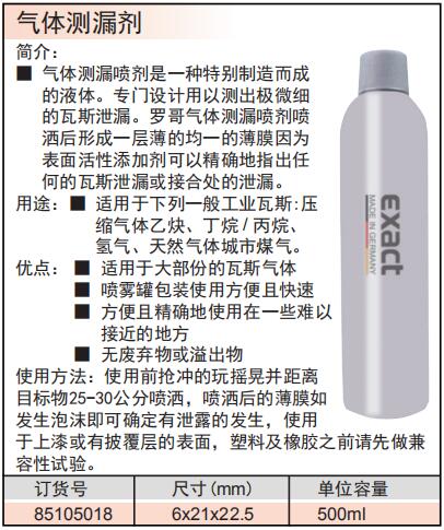 ·气体测漏喷剂是一种特别制造而成的液体。专门设计用以测出极微细的瓦斯泄漏。 ·罗哥气体测漏喷剂喷洒后形成一层薄的均一的薄膜因为表面活性添加剂可以地指出任何的瓦斯泄漏或接合处的泄漏。 ·适用于大部份的瓦斯气体 ·喷雾罐包装使用方便且快速 ·方便且地使用在一些难以接近的地方 ·无废弃物或溢出物 ·使用前抢冲的玩摇晃并距离目标物25-30公分喷洒,喷洒后的薄膜如发生泡沫即可确定有泄露的发生,使用于上漆或有披覆层的表面,塑料及橡胶之前请先做兼容性试验。