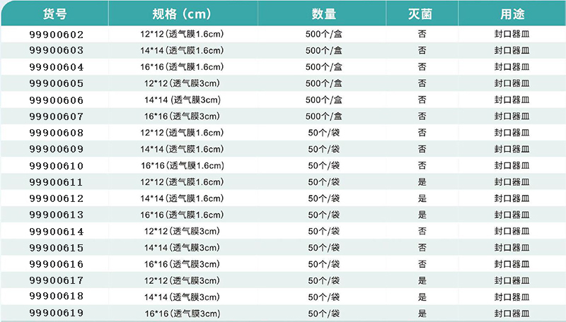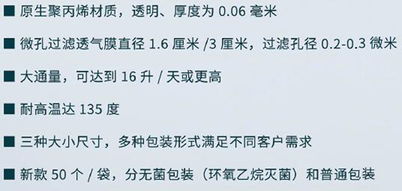 ·原生聚丙烯材质,透明、厚度为0.06毫米 ·微孔过滤透气膜直径1.6厘米/3厘米,过滤孔径0.2~0.3微米 ·大通量,可达到16升/天或更高 ·耐高温达135度 ·三种大小尺寸,多种包装形式满足不同客户需求 ·新款50个/袋,分无菌包装(环氧乙烷灭菌)和普通包装
