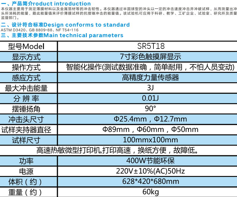 D32952 SR5T18 本仪器主要用于测定薄膜材料以及金属箔材等的冲击韧性。本仪器通过半圆球型的冲头以一定的冲击速度冲击并冲破试样,从而测量出冲头所消耗的能量,籍此能量值来评价薄膜试样的抗摆锤冲击的能量值。该试验机可应用于科研、教学、工矿企业、试验室、研究所及质量监督部门。 54400.00