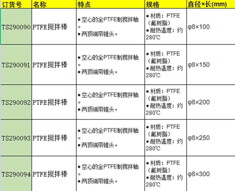 ·空心的全PTFE制搅拌轴。 ·两顶端带锥头。