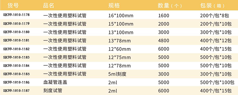 ·试管系列以优质PP、PS材料制造,试管透亮平整,化学耐受性强,其中PP抗弱酸弱碱及有机溶剂,耐高温, ·可提供各种规格,平底、圆底以及各种长度。