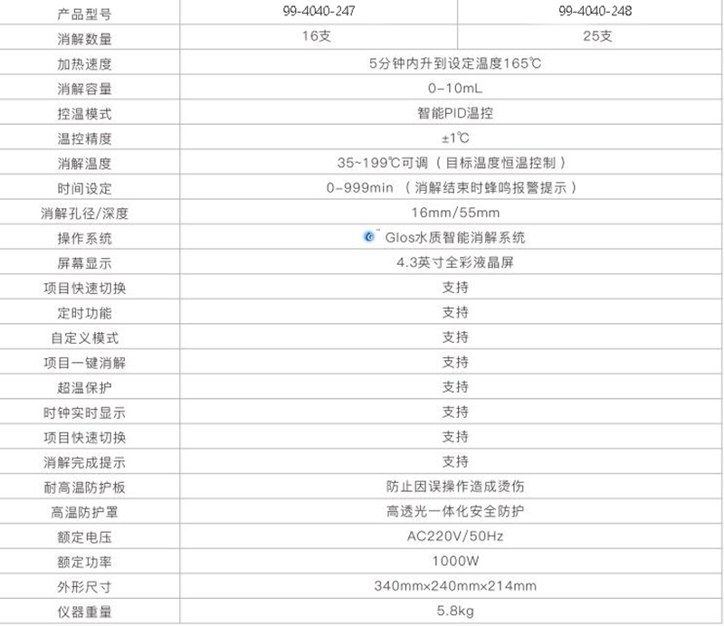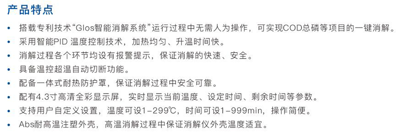 ·搭载“智能消解系统"运行过程中无需人为操作,可实现COD总磷等项目的一键消解。采用智能PID温度控制技术,加热均匀、升温时间快。 ·消解过程各个环节均设有报警提示,保证消解的快速、安全。 ·配有4.3寸高清全彩显示屏,实时显示当前温度、设定时间、剩余时间等参数。支持用户自定义设置,温度可设1-299℃,时间可设1-999min。Abs耐高温注塑外壳,高温消解过程中保证消解仪外壳温度适宜。