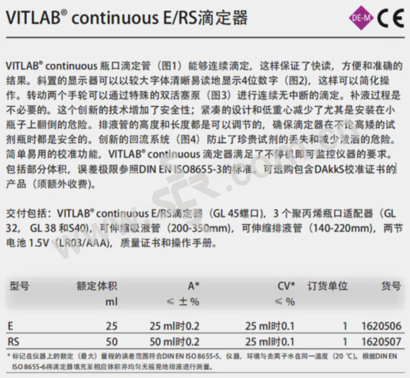 ·体积大,易握型手轮保证了滴定速率连续的控制·键盘操作使重新调整/校准简单,无需其他工具。·读数字号大,简单易读。·使用两节简易更换的1.5 V 微电池,使用寿命长。·再循环阀,避免介质损失。·360°自由旋转,准确对准瓶子标签。·使用合适的适配器,可适用于不同规格的瓶子。·可伸缩式放液管,长度高度均可调节。