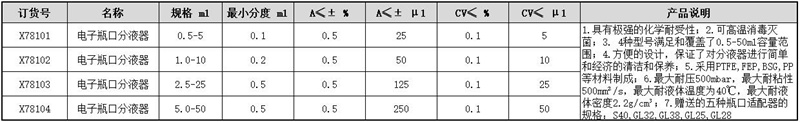 ·1.具有极强的化学耐受性; ·2.可高温消毒灭菌; ·3. 4种型号满足和覆盖了0.5-50ml容量范围; ·4.方便的设计,保证了对分液器进行简单和经济的清洁和保养; ·5.采用PTFE,FEP,BSG,PP等材料制成; ·6.最大耐压500mbar,最大耐粘性500mm2/s,最大耐液体温度为40℃,最大耐液体密度2.2g/cm3; ·7.赠送的五种瓶口适配器的规格:S40,GL32,GL38,GL25,GL30