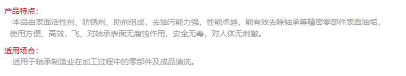 ·本品由表面活性剂、防锈剂、助剂组成,去油污能力强,性能卓越,能有效去除轴承等精密零部件表面油垢,使用方便、高效,飞、对轴承表面无腐蚀作用,安全无毒,对人体无刺激