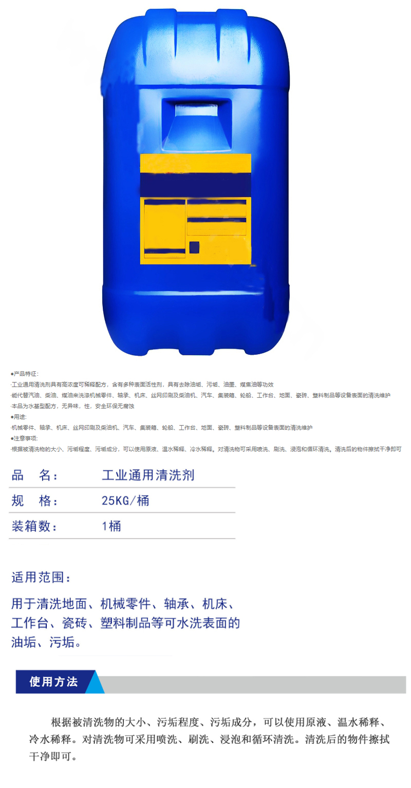 ·工业通用清洗剂具有高浓度可稀释配方,含有多种表面活性剂,具有去除油垢,污垢,油墨,煤焦油等功效 ·能代替汽油,柴油,煤油来洗涤机械零件,轴承,机床,丝网印刷及柴油机,汽车,集装箱,轮船,工作台,地面,瓷砖,塑料制品等设备表面的清洗维护 ·本品为水基型配方,无异味,性,安全环保无腐蚀