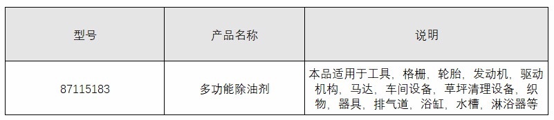 ·本品适用于工具,格栅,轮胎,发动机,驱动机构,马达,车间设备,草坪清理设备,织物,器具,排气道,浴缸,水槽,淋浴器等