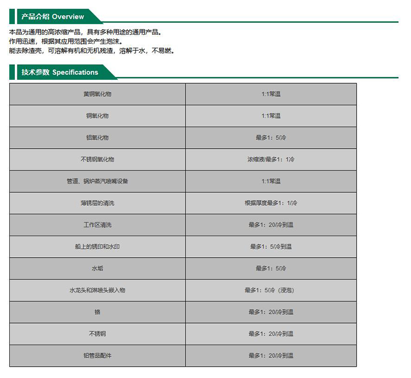 ·本品为通用的高浓缩产品,具有多种用途的通用产品 ·作用迅速,根据其应用范围会产生泡沫 ·能去除渣壳,可溶解有机和无机残渣,溶解于水,不易燃