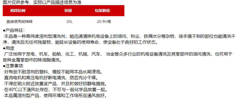 ·本品是一种高纯度溶剂型清洗剂,能迅速清除机电设备上的油污、粉尘、铁屑水分等杂物,连手摸不到的部位也能清洗干净,清洗后无任何残留物,能延长设备的使用寿命,使设备处于良好的工作状态
