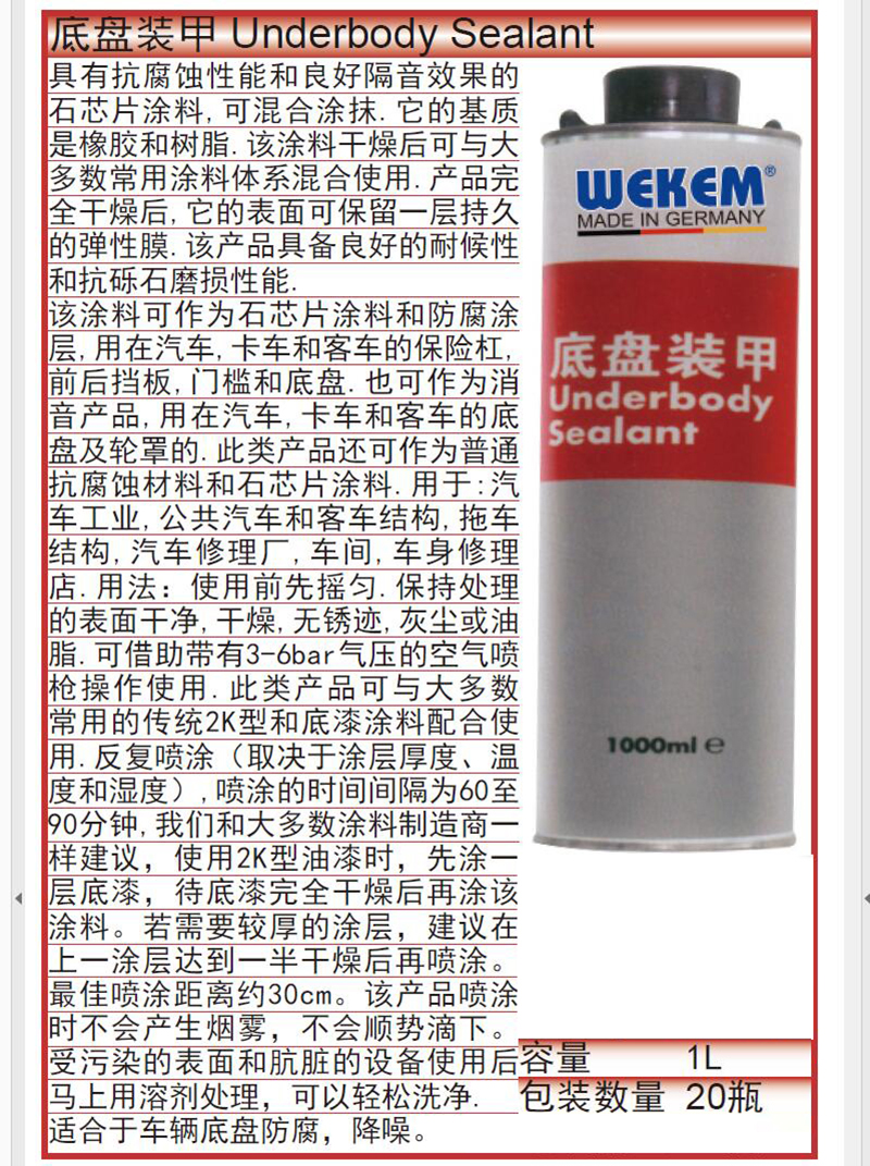 ·具有抗腐蚀性能和良好隔音效果的石芯片涂料,可混合涂抹.它的基质是橡胶和树脂.该涂料干燥后可与大多数常用涂料体系混合使用.产品完全干燥后,它的表面可保留一层持久的弹性膜.该产品具备良好的耐候性和抗砾石磨损性能. ·该涂料可作为石芯片涂料和防腐涂层,用在汽车,卡车和客车的保险杠,前后挡板,门槛和底盘.也可作为消音产品,用在汽车,卡车和客车的底盘及轮罩的.此类产品还可作为普通抗腐蚀材料和石芯片涂料. ·最佳喷涂距离约30cm。 ·该产品喷涂时不会产生烟雾,不会顺势滴下。受污染的表面和肮脏的设备使用后马上用溶剂